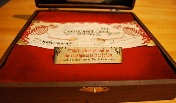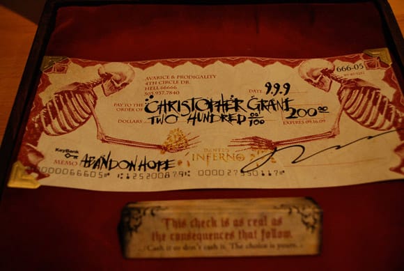 "In Dante's Inferno, Greed is a two-headed beast. Hoarding wealth feeds on beast and squandering it satiates the other. By cashing this check you succumb to avarice by hoarding filthy lucre, but by not cashing it, you waste it, and thereby surrender to prodigality. Make your choice and suffer the consequence for your sin. And scoff not, for consequences are imminent."6