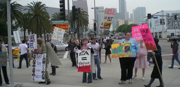 Says the Times: "The protesters, who came from a church in Ventura County, held signs with slogans such as 'trade in your playstation for a praystation' and 'EA = anti-Christ' as they marched and handed out a homemade brochure that warns, 'a video game hero does not have the authority to save and damn... ONLY GOD CAN JUDGE. and he will not judge the sinners who play this game kindly.'"